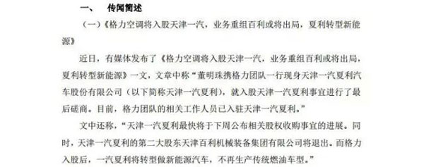 雖然在公告中并未出現“董明珠”字樣,但格力電器直接對“公司高管是否出現于一汽夏利”這個事實進行了證偽。