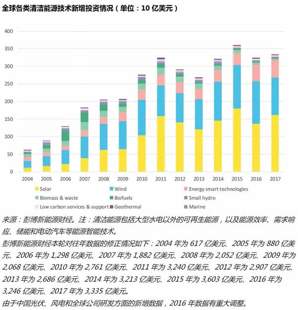 2017年全球清潔能源投資總額達(dá)3335億美元,較2016年增長(zhǎng)3%,為有史以來(lái)清潔能源投資規(guī)模第二高的年份,也將2010年以來(lái)的累計(jì)投資規(guī)模推升至2.5萬(wàn)億美元。
