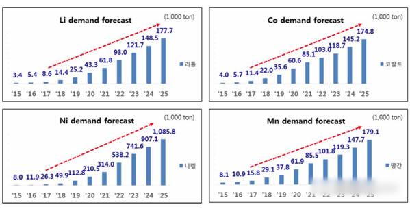 根據韓國SNE的預測,從現在到2025年動力電池行業Li資源的需求量年復合增長率將達到46%,鈷將達到41%,Ni將達到59%,Mn將達到36%。