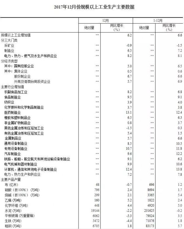 2017年12月份,規(guī)模以上工業(yè)增加值同比實(shí)際增長(zhǎng)6.2%(以下增加值增速均為扣除價(jià)格因素的實(shí)際增長(zhǎng)率),比11月份加快0.1個(gè)百分點(diǎn)。從環(huán)比看,12月份,規(guī)模以上工業(yè)增加值比上月增長(zhǎng)0.52%。2017年全年,規(guī)模以上工業(yè)增加值比上年增長(zhǎng)6.6%。