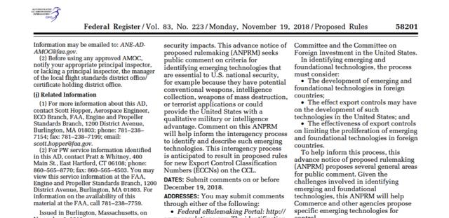 根據(jù)2018年美國(guó)國(guó)會(huì)通過(guò)的《出口管制改革法案(ExportControlReformAct)》要求,美國(guó)商務(wù)部工業(yè)安全署(DepartmentofCommerce,BureauofIndustryandSecurity,BIS)于11月19日公布了一份FederalRegisternotice,內(nèi)容為針對(duì)關(guān)鍵技術(shù)和相關(guān)產(chǎn)品的出口管制框架,并就這些新興技術(shù)的出口管制面向公眾征詢意見(jiàn),截止日期為2018年12月19日。