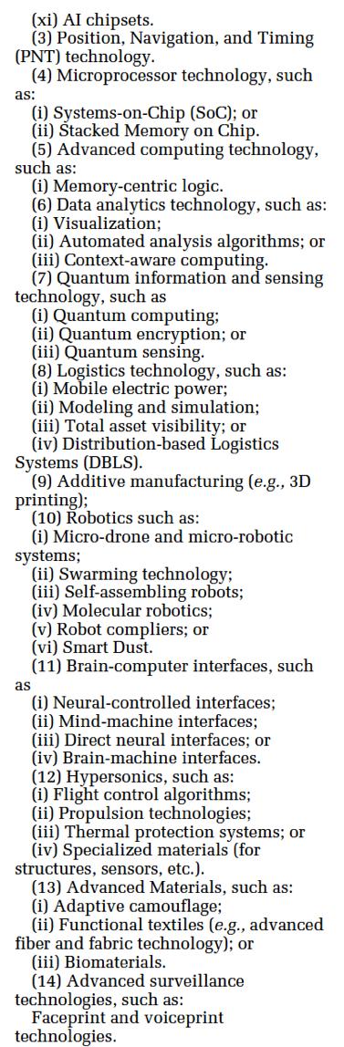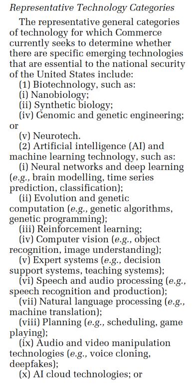 公報(bào)的第二頁(yè)則列明了將有可能被美國(guó)認(rèn)定為“specificemergingtechnologies”的行業(yè)類別,包括:生物技術(shù)、人工智能AI、定位、導(dǎo)航、微處理器技術(shù)、數(shù)據(jù)分析技術(shù)、量子信息與傳感技術(shù)等等。