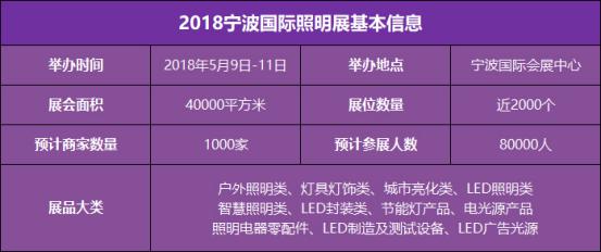 自2010年起,寧波國際照明展覽會已成功舉辦了多屆,每屆的展覽規模、參加商家、參展人數均有較大幅度的增長。2018年5月9日至11日,寧波國際照明展覽會將再次在寧波國際會展中心舉辦。展覽會將延續前一屆的展出規模,預展出面積達4萬平方米,將設置特色展示空間近2000個。