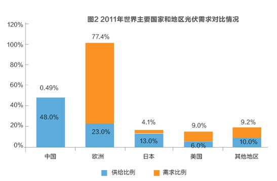 2012年左右,中國光伏產業仍處于發展起步階段。在設備制造方面,太陽能電池生產的關鍵設備大多來自國外供應商,僅此項成本便占據企業總成本的80%;在晶硅提煉方面,國內晶硅板制造企業普遍缺乏最核心的晶硅提煉技術,硅錠主要依賴美國進口,國內企業僅扮演來料加工的角色,附加值極低;在市場開發方面,中國光伏企業嚴重依賴出口,2011年,我國太陽能電池供給比例高達48%,而國內對太陽能電池需求占比僅為0.4% (見圖2)。普遍缺乏核心技術、嚴重依賴國外市場、“兩頭在外、受制于外”的畸形發展模式,嚴重掣肘中國光伏產業的持續發展。海外市場的變化,更是成為了中國光伏企業的命門所在。