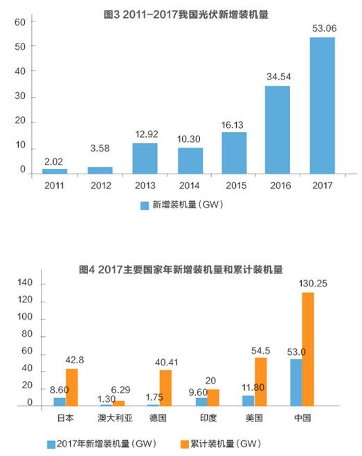 在政策指引下,國內光伏裝機總量逐年攀升(圖3),2017年我國光伏累計裝機量已經達到130.25GW,新增裝機量達到53.06GW,占全球新增裝機量的54%左右,均處于世界領先地位(圖4)。