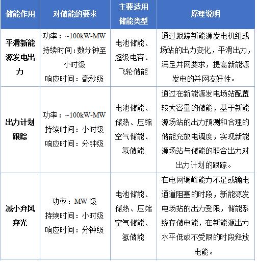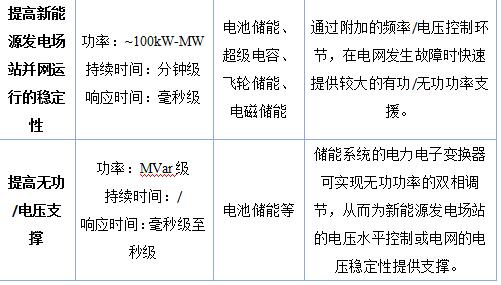 隨著可再生能源發電裝機容量的迅猛增長,風力、太陽能發電出力的隨機性和波動性給電力系統運行帶來了新的挑戰。此外,由于可再生能源出力的預測誤差相對較大,可再生能源發電場站的經濟效益在含高比例可再生能源接入的電力系統中將會受到明顯的影響。電池、超級電容、飛輪、新型壓縮空氣等儲能系統具有快速調節的性能,可以安裝在可再生能源發電場站側,起到平滑可再生能源發電出力、提高發電出力的可控性、增強可再生能源市場競爭力等作用。在我國的北方地區,因為調峰容量不足、輸電通道擁塞等原因,造成了大量棄風、棄光問題。如果在可再生能源發電場站側安裝儲能系統,則可以通過儲能充放電的優化控制,緩解輸電阻塞和電網調峰能力限制,提高可再生能源場站的上網電量。下表對儲能在可再生能源發電側的典型應用和要求進行了總結。