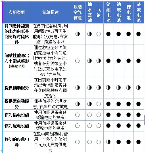 以上從發電、輸配電網、用電三個方面分析了儲能在電力系統中的主要應用。需要說明的是,對于一些類型的應用,儲能可以安裝在發電側、輸電側或配電側。根據美國能源部的報告,下表列出了儲能典型的應用類型和幾種常見儲能技術適合的應用?梢钥闯,電池儲能系統幾乎適用所有列出的儲能應用類型,而壓縮空氣儲能和抽水蓄能則主要適用于規模較大的“能量型”應用。