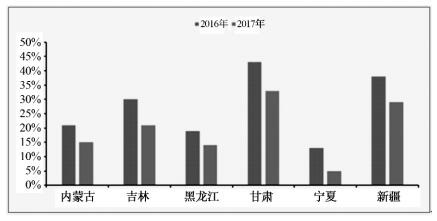 2017年全國棄風限電問題得到明顯改善,全國棄風電量同比減少78億千瓦時,棄風率同比下降5.2個百分點。其中,2017年被列為“紅六省”的甘肅、吉林、新疆、寧夏、內蒙古、黑龍江棄風率分別下降至33%、21%、29%、5%、15%、14%,同比下降在5~10個百分點左右。