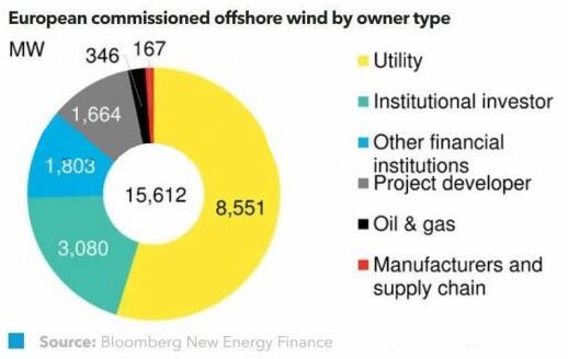 歐洲海上風電市場占全球所有現有資產的89%。公用事業公司和機構投資者擁有歐洲現役資產基礎的絕大部分,合計11.6GW。這兩者相輔相成,公用事業公司首當其沖地承擔了施工風險,而機構投資者則尋求在整個運營期內持有該資產。