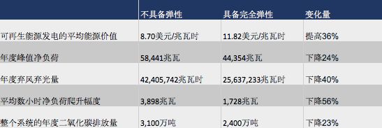需求彈性不僅可以使需求更好地匹配波動(dòng)性的能源供應(yīng),還能夠以比僅依靠燃?xì)怆姀S綜合成本更低、碳排放更少的系統(tǒng)來平衡可再生能源并滿足峰值負(fù)荷需求。總體來看,在模擬系統(tǒng)中利用需求彈性能夠每年避免大約20億美元的發(fā)電成本,并減少1/5的二氧化碳排放。這一量級(jí)的彈性需求還能夠減少40%的可再生能源棄風(fēng)棄光,降低24%的凈負(fù)荷峰值(總負(fù)荷減去可再生發(fā)電),并減少56%的數(shù)小時(shí)負(fù)荷爬升(“鴨子曲線”)平均幅度。