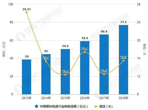 2013-2018年中國(guó)模塊電源行業(yè)銷(xiāo)售規(guī)模統(tǒng)計(jì)及增長(zhǎng)情況