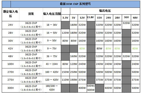 表1—Vicor DCM系列—綠色字體項目是最新DCM ChiP,提供標準及增強型VOUT穩壓版本。黑色字體項目是前期推出的產品