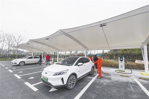 1月19日,在浙江德清縣下渚湖景區內,工作人員在新投運的電動汽車快充站為游客的電動車充電。