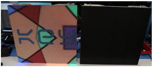 一個(gè)顯示屏箱體(由4個(gè)LED面板組成)。這兩個(gè)箱體相距約4厘米-右側(cè)箱體未連接左側(cè)箱體。