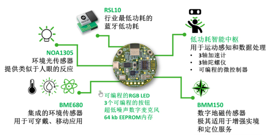 RSL10傳感器開發套件基于高度集成的RSL10系統級封裝(RSL10 SIP),含全系列低功耗配置傳感器,包括環境、慣性和環境光傳感器。