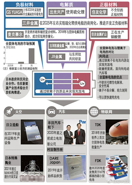 圍繞被認為是純電動汽車(EV)和物聯網“IoT”普及關鍵要素的“全固體電池”,日本眾多廠商爭相進行研發。全固體電池的特點是不使用可燃液體,而是使用不易燃的固體電解質。這種電池安全且可以實現更大的能量輸出。著眼于2020年代中期的普及期,日本廠商向確立量產技術等課題而發起挑戰。