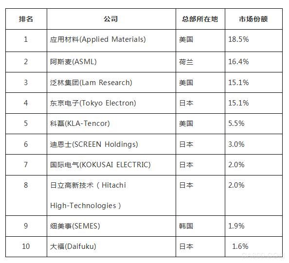 據研究機構Gartner統計數據顯示,2018年全球市場份額最高的十大半導體設備制造企業中多為美日企業。