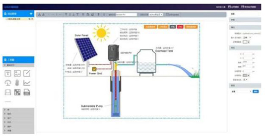 例如光伏水泵行業,用戶可能關心的監控參數是PV電壓,收益,發電量,總流量等,那么就可以通過組態可視化界面(如下圖),對這些需要監控的參數進行組合,定制專屬于行業的監控方案,其他行業如電機,空壓機,糧食機械,高壓等均可定制專屬方案。