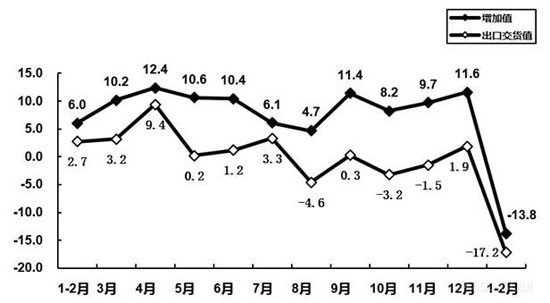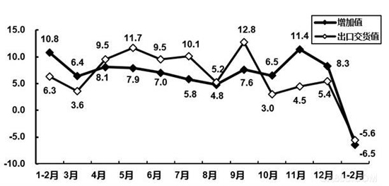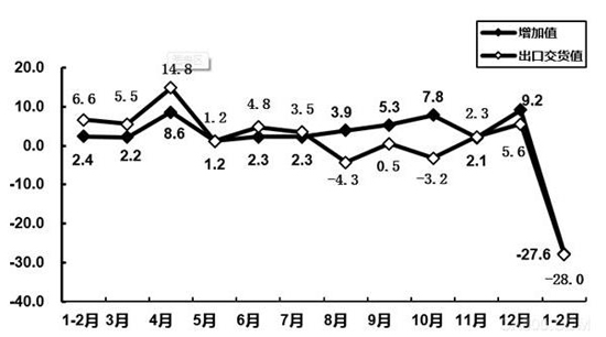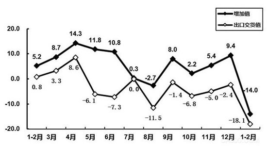 圖1 2020年1-2月以來電子信息制造業增加值和出口交貨值分月增速(%)