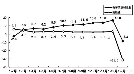 1-2月份,電子信息制造業固定資產投資同比下降8.3%,比去年同期回落5.7個百分點。