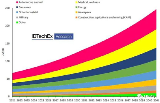 2021年~2041年按應用領域劃分的全球傳感器市場預測
