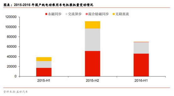 由于我國稀土資源豐富,因此電動(dòng)乘用車多采用功率性能高、體積較小的永磁同步電機(jī)。根據(jù)中國汽車工業(yè)協(xié)會(huì)統(tǒng)計(jì)數(shù)據(jù),2016年上半年,我國純電動(dòng)汽車產(chǎn)銷量分別達(dá)到13.4萬輛、12.6萬輛,同比分別增長160.8%、161.6%。上半年生產(chǎn)純電動(dòng)乘用車約70000輛,其中永磁同步電機(jī)的裝機(jī)占比約為65.7%,比2015年同期增長21.25個(gè)百分點(diǎn),比2015年全年增長了19.99個(gè)百分點(diǎn)。同期,國產(chǎn)新能源乘用車用交流異步電機(jī)的市場分額在逐漸減小,從2015年上半年的35.1%下滑至2016年上半年年的32.9%;而混合勵(lì)磁同步電機(jī)的占比則從0.03%上升至1.10%。