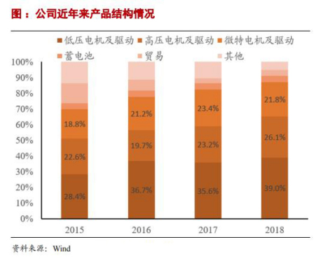 目前,臥龍電氣產(chǎn)品涵蓋各類微特電機(jī)及控制、低壓電機(jī)及控制、高壓電機(jī)及控制及電源電池等40大系列3000多個(gè)品種。電機(jī)及控制裝置作為臥龍電氣的核心主業(yè),在其業(yè)績占比逐步提升:2015年占營收比重約69.7%,2018年占比提升至86.9%。在高壓、低壓、微特電機(jī)三大系列電機(jī)及控制裝置產(chǎn)品中,低壓電機(jī)及驅(qū)動(dòng)占總營收比重的39.0%,為最大業(yè)務(wù)。