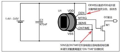 上圖是內(nèi)置M9401芯片的智能型熱釋電傳感器的最小工作系統(tǒng),在熱釋電數(shù)字探頭內(nèi)部集成了全新的智能型PIR信號(hào)調(diào)理芯片M9401。傳感器的靈敏度以及ONTIME的值可以在這兩個(gè)引腳上設(shè)計(jì)電阻分壓器或者是電位器,通過調(diào)節(jié)這些硬件電路來調(diào)整傳感器的不同工作狀態(tài)。另外,OEN引腳可以外接光敏電阻來控制傳感器在白天、晝夜的環(huán)境中交替工作。相比之前的智能數(shù)字探頭,采用M9401芯片的探頭功耗大大降低,同時(shí),其所具備的自檢功能可滿足探頭廠家的半成品自動(dòng)檢測(cè),節(jié)約了后續(xù)的檢測(cè)工序成本。