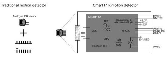 M9401專門為智能式單芯片熱釋電傳感器量身打造,減少了外部單片機(jī)及運(yùn)算放大電路。它具有極小的芯片面積、特殊的輸入、輸出電路結(jié)構(gòu)和片內(nèi)信號(hào)處理能力,可以集成在PIR探頭內(nèi)部與陶瓷敏感元直接連接,檢測(cè)到人體感應(yīng)并輸出觸發(fā)事件。我們稱之為智能PIR傳感器(右下圖),它取代了傳統(tǒng)模擬探頭加外部芯片的分立方案(左下圖)。該智能方案具有高靈敏度、功耗極低、外圍電路配置簡(jiǎn)單靈活、高可靠性、抗RF干擾能出眾等優(yōu)點(diǎn)。基于上述這些優(yōu)點(diǎn),該方案在盡可能減少外部元器件數(shù)量的同時(shí)又能適用于非常寬廣的應(yīng)用領(lǐng)域。