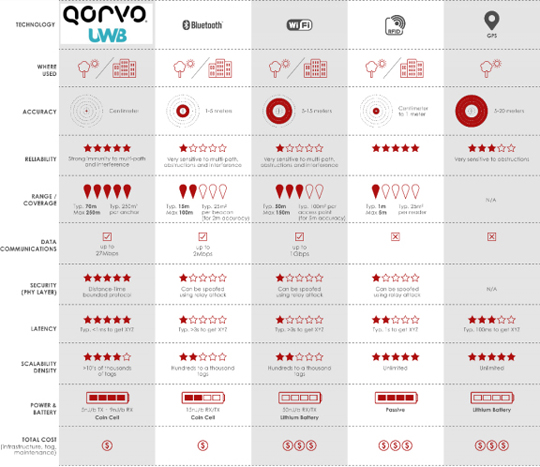 圖題:UWB與現行多種定位技術對比 來源:Qorvo