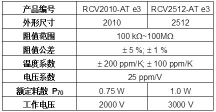 RCV-AT e3系列器件阻值范圍從100 k(到100 M(,公差分別為(1%和(5%,溫度系數為(100 ppm/K和(200 ppm/K。電阻額定功率為1.0 W,電阻電壓系數低至25 ppm/V,工作溫度為-55(C至+155(C。