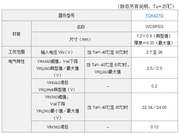 東芝將繼續開發TCK42xG系列,并計劃推出總共六款產品。TCK42xG系列的過壓鎖定將支持5V至24V的輸入電壓。可提供5.6V和10V兩種類型的柵極輸出電壓,用于外部MOSFET中不同的柵源電壓。過壓鎖定和柵極輸出電壓可以根據用戶具體設備進行選擇。