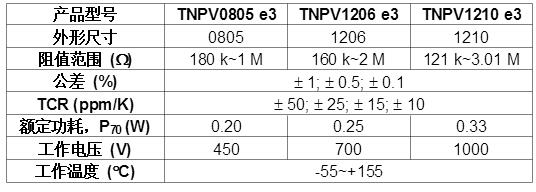 TNPV e3系列電阻外形尺寸分別為0805、1206和1210,阻值為121 k(至3.01 M(,工作溫度-55(C至+155(C、最大外形尺寸器件工作電壓最高可達(dá)1,000 V。電阻在各種環(huán)境條件下非常穩(wěn)定可靠,額定功率和+70°C環(huán)境溫度下,1,000小時(shí)最大電阻變化率≤0.05%,具有優(yōu)異的防潮性(85°C,85%相對(duì)濕度),耐硫能力符合ASTM B 809規(guī)定。