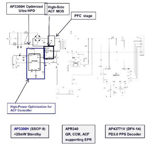 本方案的核心由四個主控制器UCC28056、AP3306、APR340和AP43771V組成。其中,UCC28056B是過渡模式升壓PFC控制器。AP3306是一款高度集成的有源箝位反激(ACF)控制器,主要針對離線電源優化設計,可滿足超低待機功耗、高功率密度和全面保護的需求。APR340是次級側同步整流(SR)控制器,它可用作同步的次級側MOSFET驅動器DCM操作中的整流,為方案有效降低次級側整流器功耗并提供高性能。