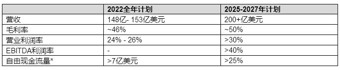 下表為與公司先前披露的2022全年?duì)I收計(jì)劃相關(guān)的財(cái)務(wù)預(yù)期,以及昨天在資本市場(chǎng)日會(huì)議上分享的2025-2027年新目標(biāo)。