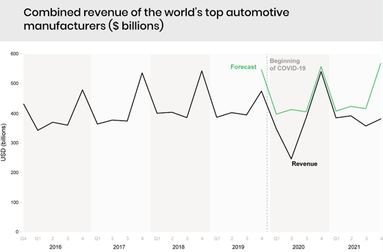 在全球經歷的首輪疫情封鎖期間,由于消費者需求大幅下降,汽車制造商在2020年第二季度損失的銷售額超過1660億美元。雖然客戶需求在接下來的兩個季度開始回歸,但在2021年的每一個季度,汽車制造商都因供應鏈短缺而無法滿足需求。