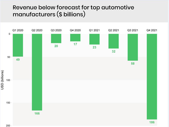 因此,汽車制造商在2021年損失了超過3000億美元的收入,第四季度是過去十年以來最糟糕的季度。與疫情前的預測相比,汽車制造商的銷售額減少了超過1860億美元。