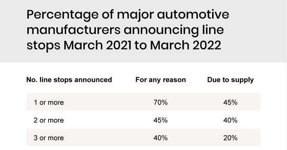 全球主要汽車制造商中,有70%在過去一年中曾宣布暫停生產線,其中45%特別提到了供應鏈短缺問題。在總部位于歐洲和美國的企業中,這個比例甚至更高——這些地區60%的主要汽車制造商在過去12個月中曾宣布因供應短缺問題而關閉工廠。