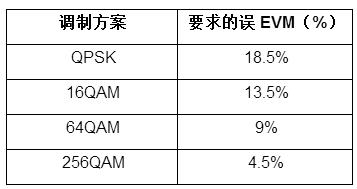 更高階的調(diào)制方案能夠在不增加信號帶寬的情況下提高數(shù)據(jù)速率,而各符號間隔更近,從而對噪聲也更敏感。隨著調(diào)制密度增加,器件需要更好的調(diào)制質(zhì)量。表1列出了3GPP Rel-16技術(shù)規(guī)范38.141中針對5G NR基站規(guī)定的誤差矢量幅度(EVM)要求。3GPP也在考慮采用對設(shè)計和測試裕量有更嚴格要求的1,024 QAM。