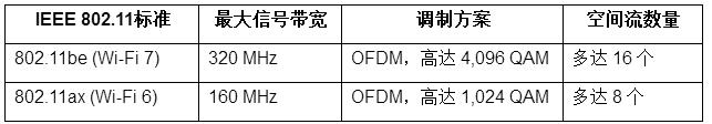 與IEEE 802.11ax相比,新一代Wi-Fi標準IEEE 802.11be(Wi-Fi 7)可提供兩倍信號帶寬、16個空間流和四倍的調(diào)制方案密度。它們共同提供高達40 Gbps的數(shù)據(jù)速率。表2列出了IEEE 802.11物理層的重大變更。