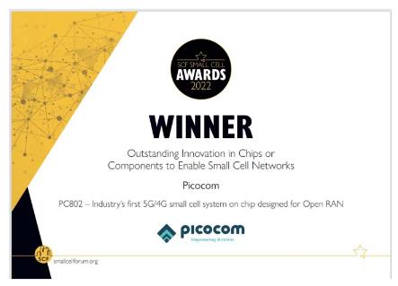 中國杭州-2022年6月-5G小基站基帶芯片和運營級軟件提供商比科奇高興地宣布,公司日前成為2022年度全球小基站論壇(SCF)大獎的獲勝者。比科奇憑借其PC802芯片獲得了該獎項的“小基站網絡芯片與組件杰出創新獎”。PC802芯片是業界首款專為滿足包括Open RAN等標準而設計的4G/5G小基站系統級芯片(SoC)。
