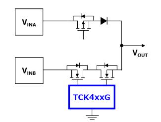 在新推出這五款產品后,TCK42xG系列現在允許用戶從10V和5.6V這兩種類型的柵源電壓中進行選擇,這覆蓋了更多規格的MOSFET。憑借輸入過電壓鎖定功能的多種檢測電壓,該產品能用于5V至24V的電源線路。如果與外部背對背MOSFET結合使用,它們也適用于配置具有反向電流阻斷功能的負載開關電路(圖1)或電源多路復用器電路(圖2)。除此之外,其內置的電荷泵電路支持從2.7V至28V的寬輸入電壓范圍,因此經過間歇操作,可在外部背對背MOSFET的柵極和源極之間提供穩定的電壓---這種方式允許大電流的切換。