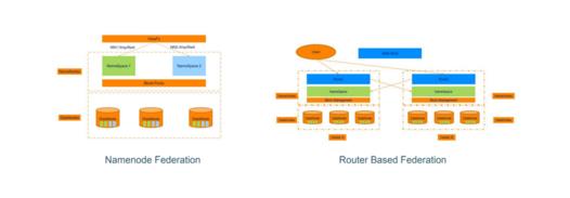 而在RBF的聯(lián)邦方案中,嘗試把“掛載表”從Client中抽離出來形成了Router,雖然Hadoop集群是獨立的,但同時又增加了一個“State Store”組件,架構(gòu)變得更復(fù)雜。