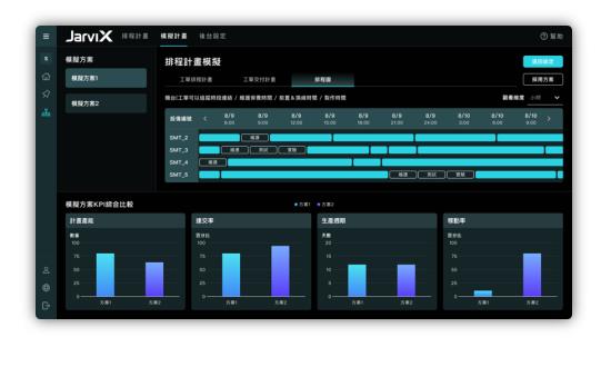 同時,操作易用和可視化應(yīng)用也是JarviX平臺的一大亮點。即便是沒有深度IT背景的普通員工,只需在JarviX平臺輸入所需要的工單和KPI設(shè)定,即可獲取多種方案選擇,且會同時提供包括動態(tài)演算、機臺甘特圖和經(jīng)營預(yù)估在內(nèi)的多項可視化應(yīng)用,幫助使用者更直觀的對各個方案進行綜合比較。