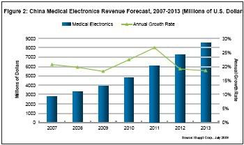 據iSuppli 公司預測,中國政府將在2009至2013年大規模投資于醫療保健產業,促進該國醫療電子設備的銷售強勁增長。2009年中國醫療電子設備銷售額將增長18.2%,從2008年的33億美元增長到39億美元。未來幾年將保持這種強勁勢頭,復合年增長率將達21%,到2013年上升到86 億美元。