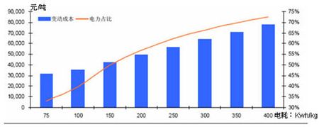 ● 國(guó)內(nèi)企業(yè)在綜合電耗高的在300kWh/kg以上,電耗低的則在200kWh/kg左右