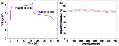 在此基礎上,他們又設計出一種三維混合導電網絡結構電極材料(圖1b),并成功地在正極材料LiFePO4上得到了驗證(圖1a)。在該研究中,研究人員將LiFePO4納米顆粒均勻的鑲嵌在多孔碳中(圖1a),開發(fā)出倍率性能優(yōu)異的復合正極材料。電池測試結果表明,該復合正極材料不但可以在16秒內完成超快速充電和16秒內完成超快速放電過程(圖2a),而且在1.5C倍率下700次充放電循環(huán)后,容量保持率仍可達97%以上(圖2b)。■