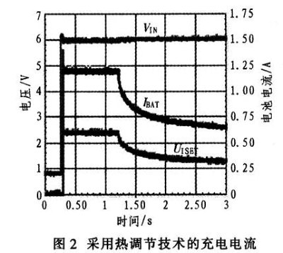 如何改進設計才能確保充電器在安全散熱范圍內正常工作呢?更高級的電池充電器(如bq2406x與bq2403x)引入了熱調節環路,可避免充電器過熱。內部芯片溫度達到預定義的溫度閾值后(如110℃),器件溫度只要進一步提升就會使充電電流下降。這有助于限制功耗,并為充電器提供熱保護。使IC結溫升高到熱調節的最大功耗取決于PCB板布局、散熱通孔的數量以及環境溫度。從圖2看出,1.2 s之后,熱環路會在2 s內將有效充電電流從1.2 A降至600 mA。