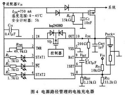 許多應用都要求在電池充電同時給系統供電。如圖l所示,系統直接連接到電池充電輸出,系統和充電器間的相互影響會使安全計時器生成錯誤充電終止信息。圖4為能夠解決上述問題的典型應用電路。這里有兩個獨立的電源路徑,一個給電池充電,另一個給系統供電。如果AC適配器不可用,那么電池放電MOSFET在R4和C2設置的時間延遲之后就會打開,這樣電池就能給系統供電了。