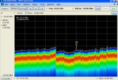 我們還有必要考察一下與繞過預選功能的頻譜儀相比,RSA6120的交換式濾波預選功能怎樣有效地減少放射本振輻射。在下面的實例中,我們使用擁有DPX顯示技術的泰克頻譜儀,把左面的傳統頻譜儀與RSA6120進行對比。上面的藍色頻段表明本振放射。如這里所示,左面的頻譜儀實際上變成一條RF波束。RSA6120A可以顯示最小的本振饋送放射,對被測設備幾乎沒有影響,使用掃描接收機很難檢測到。■